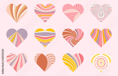 Vector set of swirling ridial Valentine's day hearts. spiral, sunburst, spinning rays patterns. Twisted and distorted vector texture in trendy retro groovy hippie 70s psychedelic style. Y2k aesthetic.