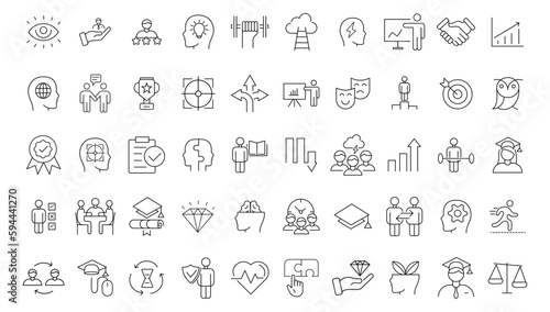 Vector set thin icons related to career progress, coaching, business people training, tutorship and professional consulting service. Mono line pictograms and infographics design elements