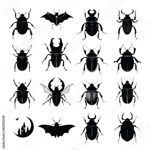 Vector silhouette set of Halloween Beetle isolated in White background, silhouette Set, Halloween theme, Vector illustration