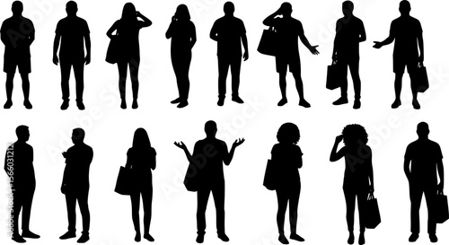 Vector silhouettes men and women, illustration. Silhouettes of young people posing in casual clothes. EPS 10 version.