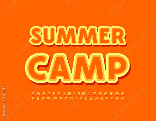 Vector sunny emblem Summer Camp. Sticker Alphabet Letters and Numbers set. Bright creative Font