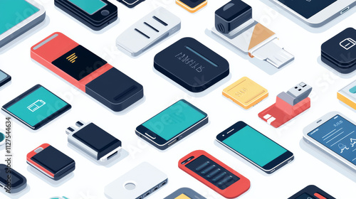Vector technology usb, battery and connector cartoon icon set. Isolated smart device and computer accessories graphic illustration. Portable powerbank, thumbdrive and smartwatch neon symbol design