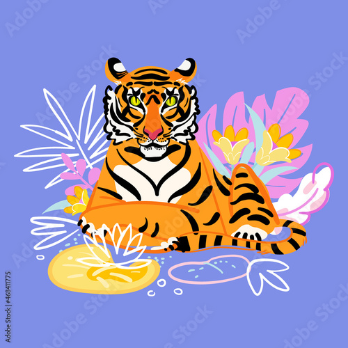 Vector tiger with line leaves and flowers on violet background. Flat style illustration. Chinese 2022 year sign.