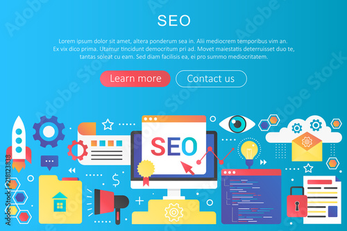 Vector trendy flat gradient color seo optimization concept template banner with icons and text.