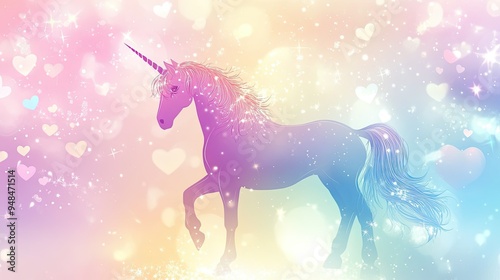 Vector unicorn background with pastel colors, hearts, and bokeh, sprinkled with magical stars in a dreamy scene.
