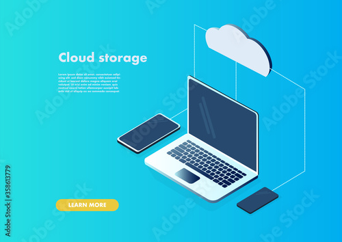 Vector web page of uploading media to the cloud with copy space. Smartphone tablet and laptop on blue background