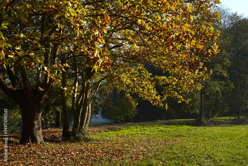 Veduta autunnale di boschi nebbiosi alla confluenza con il Lago d'Iseo. Provincia di Brescia, Lombardia, Italia.