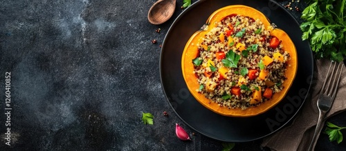 Vegan Stuffed Acorn Squash with Quinoa and Colorful Vegetables on Dark Table with Copy Space for Text or Branding