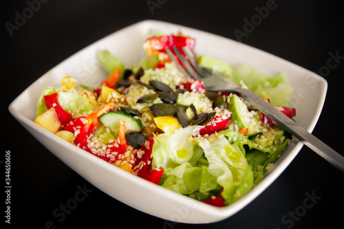 Vegetable Salad. Salad of tomato, cucumber, lettuce, sprinkled with sesame seeds. Salad in a white plate.
