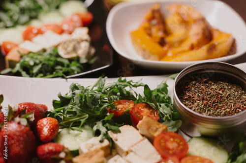 Vegetarian lunch bowl detox: sliced vegetables: cucumbers and tomatoes with herbs, spices and red strawberries and tofu, banana, pumpkin