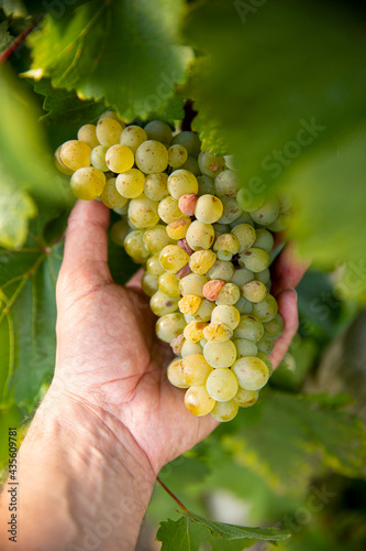 Vendange à la main dans un vignoble, récolte du raisin blanc.