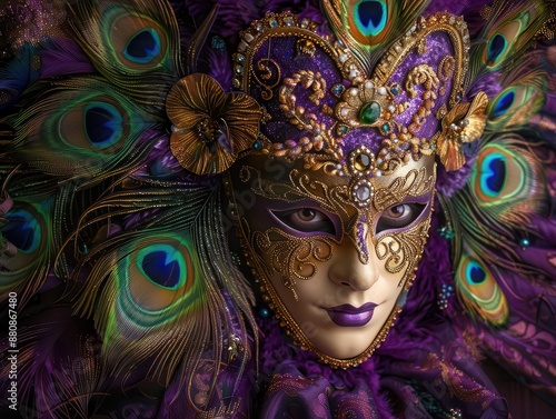 venetian carnival mask adorned with iridescent peacock feathers and intricate gold filigree mysterious eyes peek through ornate design set against deep purple velvet backdrop