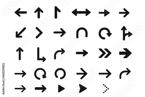 Versatile Black Arrow Icons Set. Vector Collection of Direction Arrows, Navigation Symbols, Cursor Pointers, U-turn, Circular, Diagonal, and Right Angle Arrow Signs for Interface and Map Design