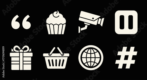 Versatile Icon Collection: A compilation of assorted icons is presented, against a dark background in a clean, simple design language