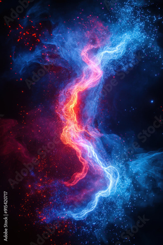 Versus background, A dynamic splash of blue and red neon energy colliding in mid-air, surrounded by a dark backdrop. The energy forms intricate, swirling patterns, creating a