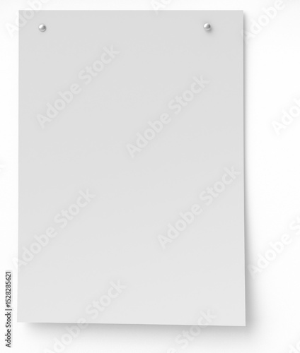 Vertical blank paper sheet attached with transparent tape on white background. Realistic stationery mockup for design or presentation.