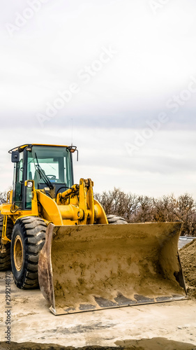 Vertical Focus on a yellow bulldozer with dirty bucket and wheels at a construction site