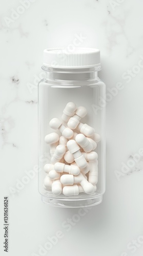 Vertical image of a clear pill bottle with pills inside on a white marble backdrop, representing purity.