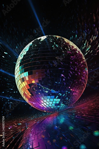 Vertical image of a stunning disco ball with fantastic colorful lights and a vibrant background of colors. Generative AI