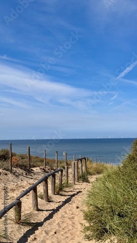 Vertical image of the beautiful nature of the dune landscape in Noordwijk aan Zee outdoor at daytime during summer with ocean view in The Netherlands with space for text.