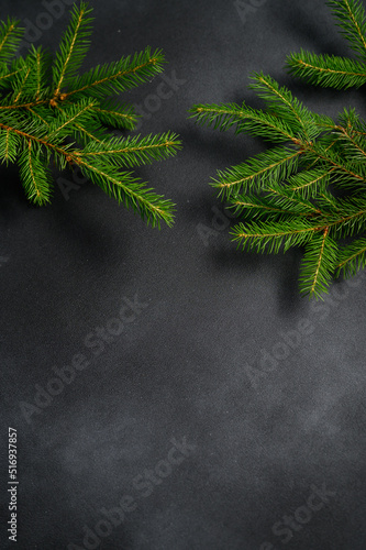 Vertical photo Christmas fir Branches up in Air on Dark Background with Copy Space at Bottom.