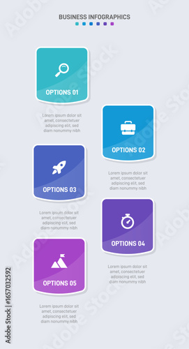Vertical progress bar featuring 5 arrow-shaped elements, symbolizing the five stages of business strategy and progression. Clean timeline infographic design template. Vector for mobile presentation.