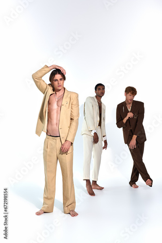 vertical shot of multicultural young men moving relaxedly in vivid classy attires on white backdrop