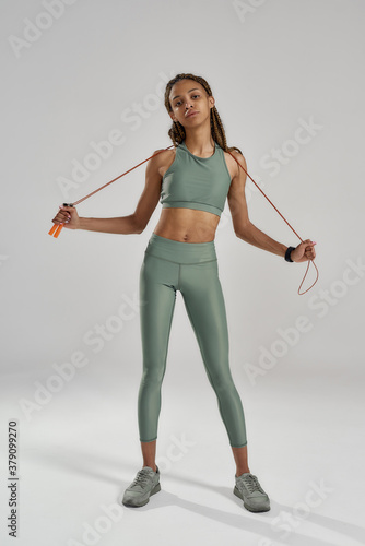 Vertical shot of young mixed race fitness woman in sportswear exercising with skipping or jumping rope, standing against grey background and looking at camera