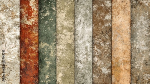 Vertical stripes of textured, grunge backgrounds in various earth tones.