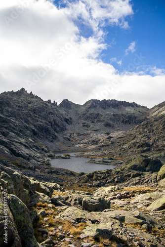 Vertical View of Laguna Grande and Jagged Peaks in Gredos Mountains with Rocky Foreground and Cloud-Draped Sky in Remote Alpine Wilderness