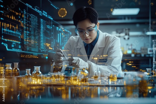 Very realistic and photographic photo of an Asian Chinese lab chemist analyzing a test with high-tech equipment in a futuristic lab environment. Complex data displays surround the scene, emphasizing