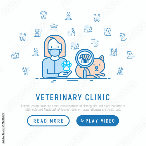 Veterinary clinic concept: treatment from tick and flea for cat. Thin line icons: injection, cardiology, cleaning of ears, teeth, shearing claws, broken leg. Vector illustration, web page template.