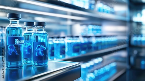 Vials of Medical Products in Cold Storage with Cool Blue Lighting and Blurred Background