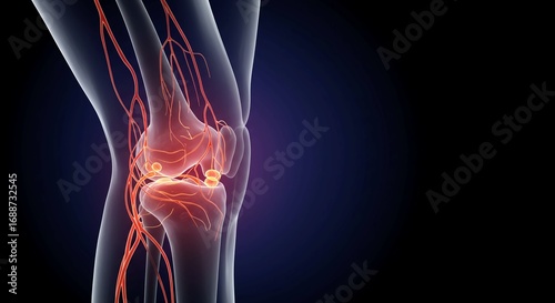 Vibrant 3D rendering showcases the intricate network of nerves and blood vessels within a human knee joint, offering a dynamic medical visualization.