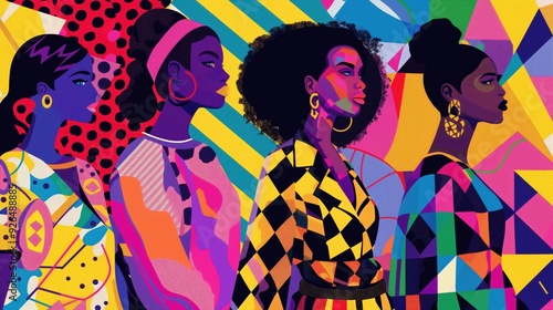 Vibrant abstract art of diverse women celebrating empowerment and equality in colorful geometric patterns