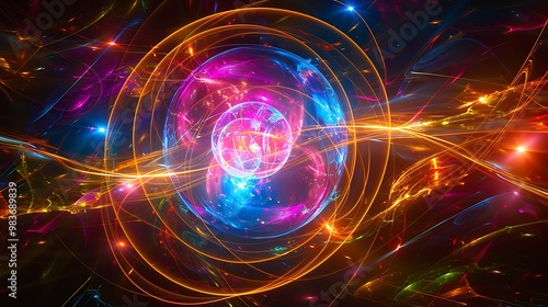 Vibrant abstract art with glowing orbs and lights in a cosmic or futuristic setting.