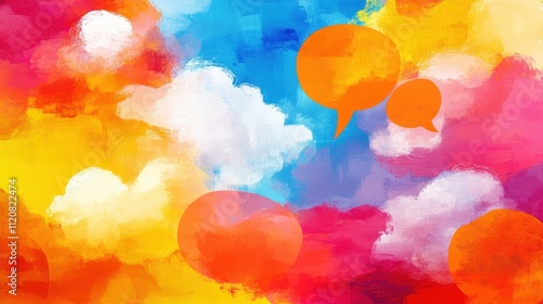 Vibrant Abstract Artwork: Colorful Clouds and Speech Bubbles Representing Communication and Ideas