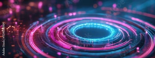 Vibrant Abstract Background with Glowing Circular Patterns and Light Particles Illuminating a Futuristic Digital Landscape in Pink and Blue Tones