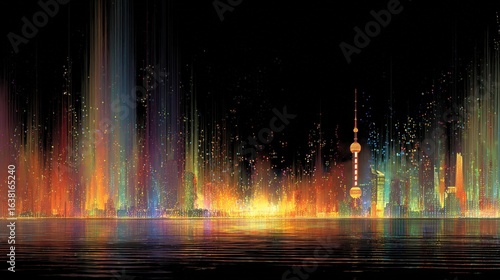 Vibrant Abstract Cityscape Reflection on Water, Night Scene with Colorful Light Streaks and Reflections