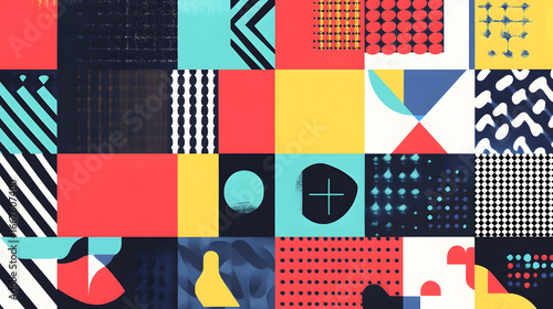 Vibrant abstract collage with retro geometric shapes and textures for modern designs and creative backgrounds.