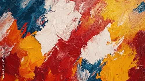 Vibrant abstract composition showcasing dynamic brush strokes in bold reds, yellows, blues, and whites on a textured canvas background.