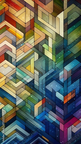 Vibrant abstract composition with interlocking colorful geometric blocks, creating a three-dimensional effect with warm and cool tones, resembling a modern cityscape or maze-like structure