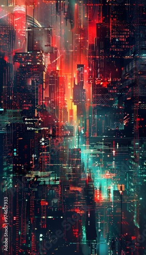 Vibrant abstract cyberpunk cityscape with shimmering neon lights and flowing digital code patterns