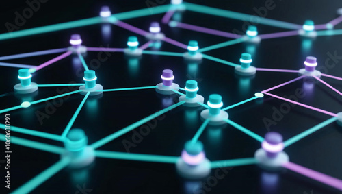 vibrant abstract digital connection with glowing data points and neon highlights, showcasing tech grid design. interconnected nodes create sense of depth and innovation