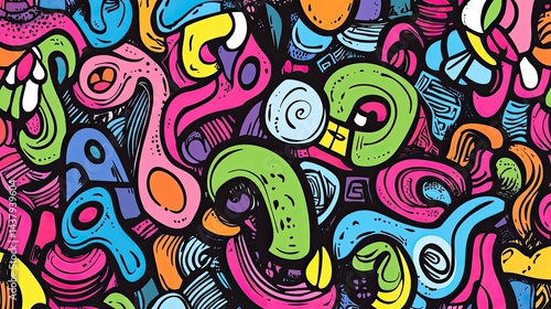 Vibrant abstract doodle pattern with a variety of shapes and colors. Intricate design features flowing lines, geometric forms, and bold outlines