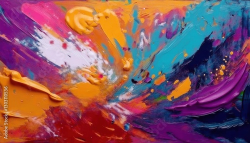 vibrant abstract expressionism painting with bold brushstrokes of yellow, blue, and magenta on a textured purple canvas