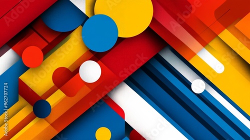 Vibrant abstract geometric background featuring dynamic shapes and bold colors like red, blue, yellow, and white creating a visually stunning composition.