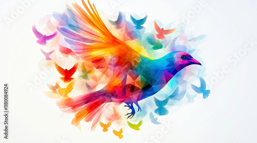 Vibrant Abstract Geometric Bird with Multicolored Wings in Flight on white background