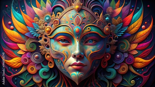 Vibrant, abstract, geometric mask with swirling patterns and shapes, covering a pale face, with bold, bright colors and intricate details, against a dark, gradient background.
