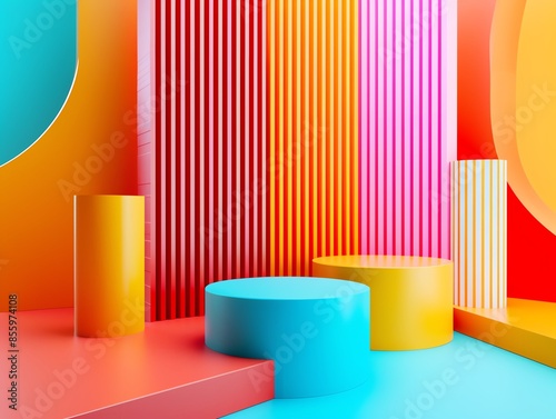 Vibrant abstract geometric shapes and colorful 3D structures create a modern visual impact. Bright cylinders, blocks, and lines in dynamic colors.